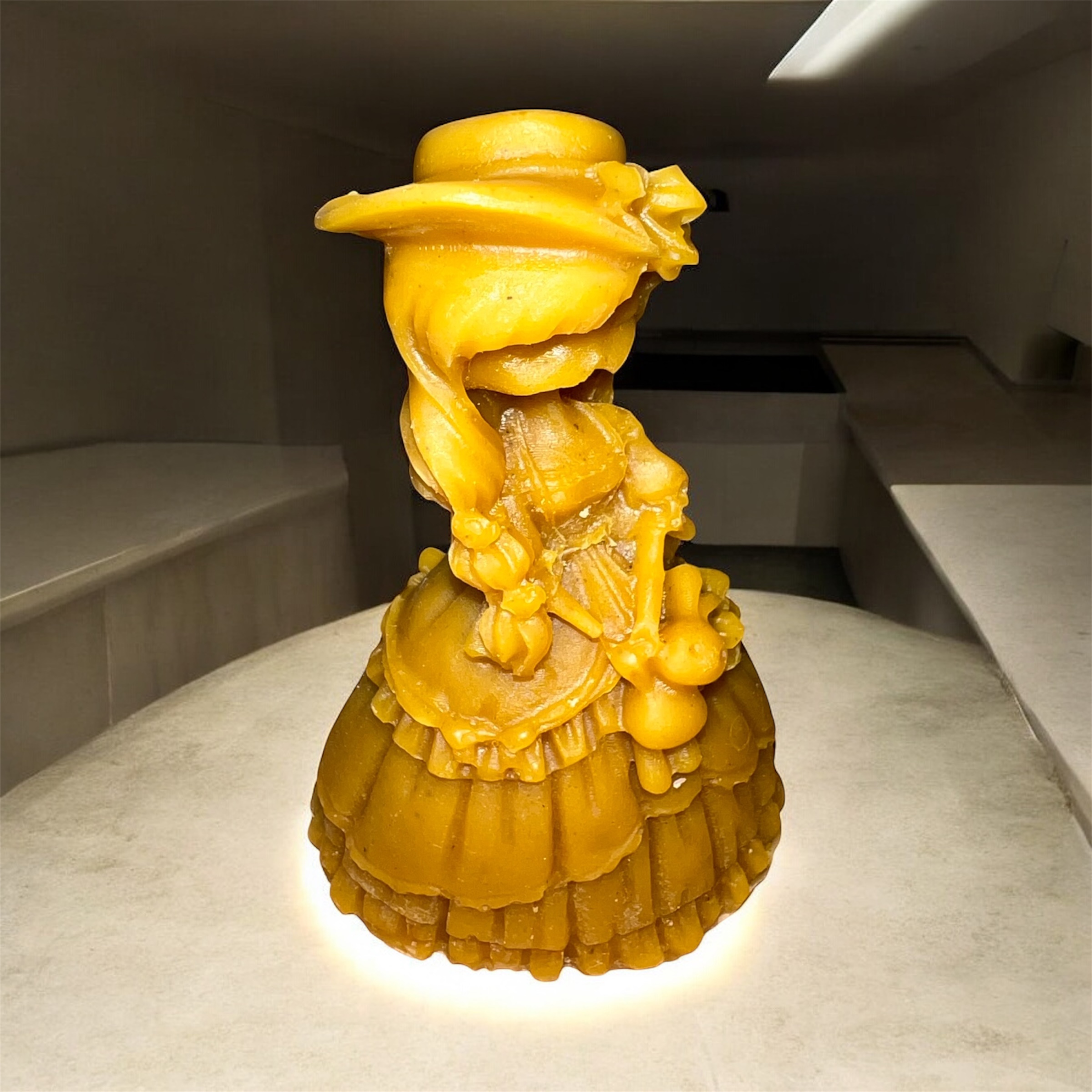 Figura artesanal natural de cera de abeja con la elegante figura de una señorita. Ideal para decorar con estilo y aportar un toque delicado y sofisticado a cualquier espacio