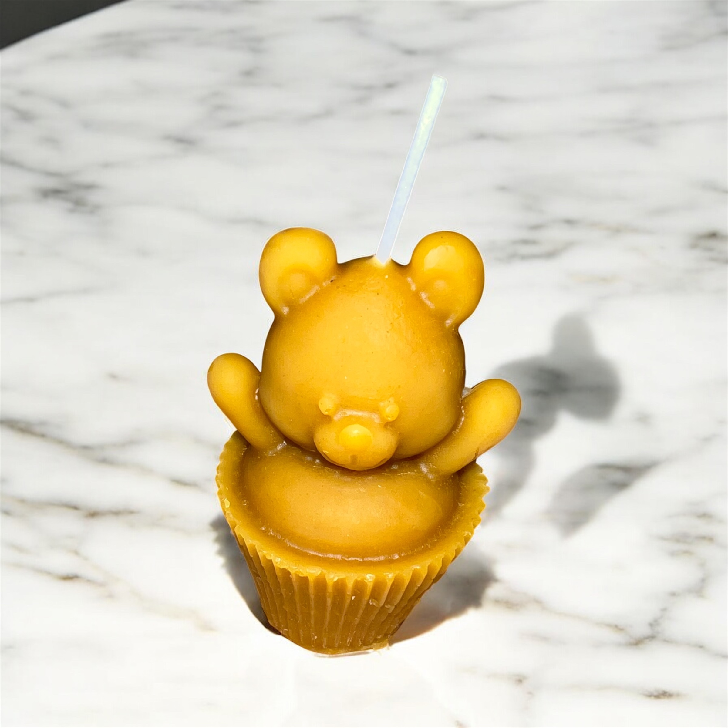 Vela artesanal natural de cera de abeja con la tierna figura de un oso dentro de un molde de magdalena. Perfecta para decorar con dulzura cualquier espacio adorable.