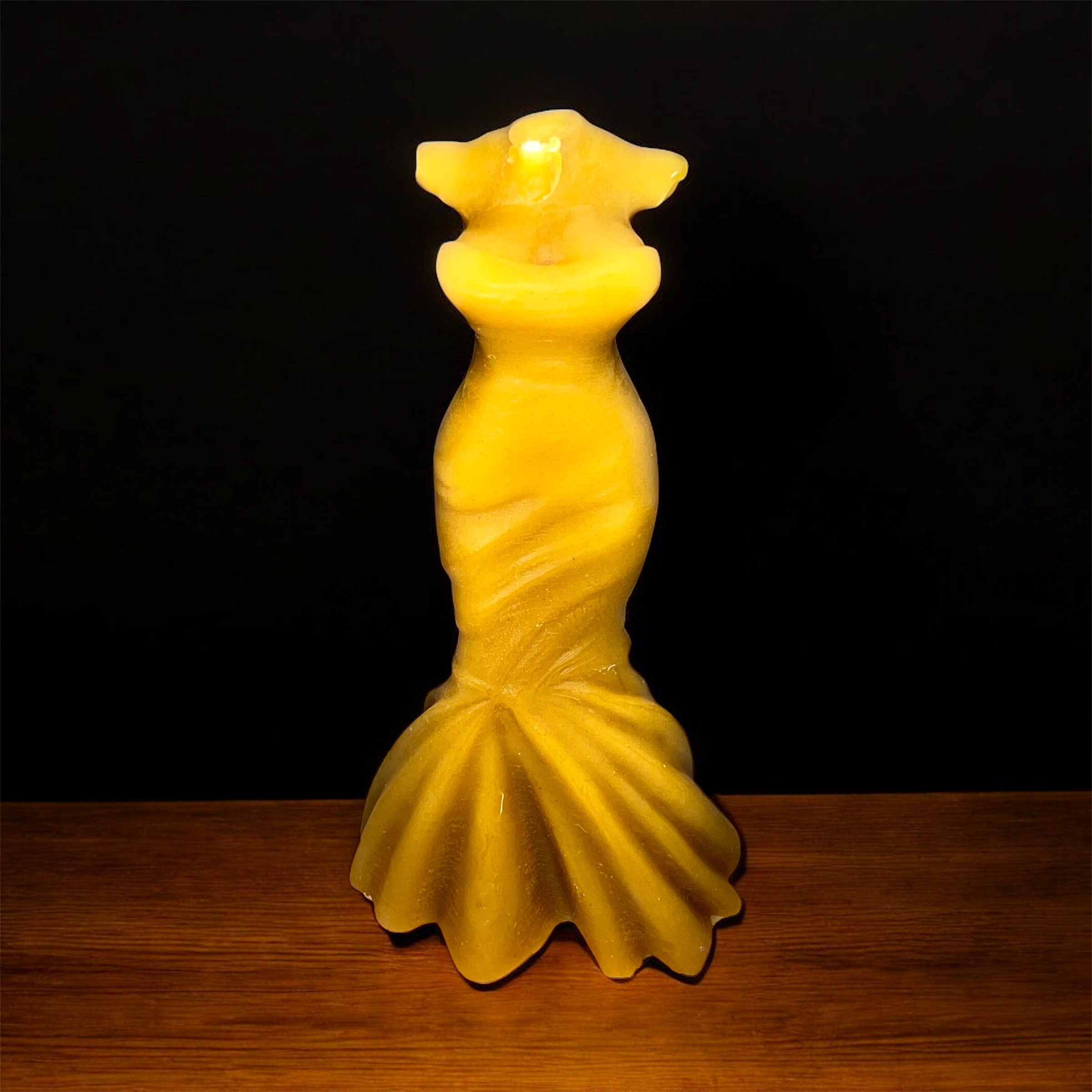 Vela artesanal natural de cera de abeja con la elegante figura de un vestido. Ideal para decorar con estilo y aportar un toque de sofisticación a tu hogar.