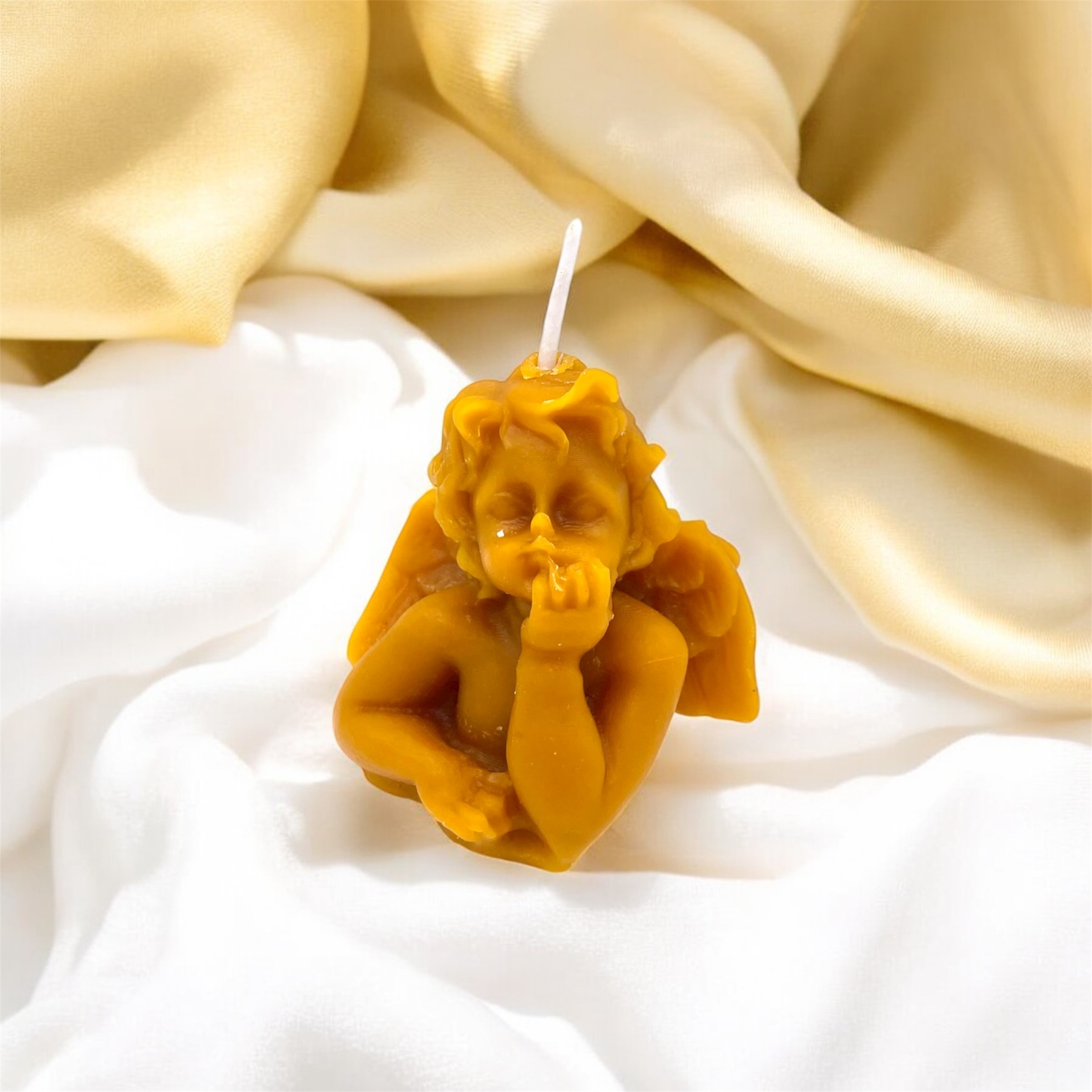 Vela artesanal natural de cera de abeja con la delicada figura de un ángel en actitud reflexiva. Perfecta para crear un ambiente sereno y lleno de espiritualidad